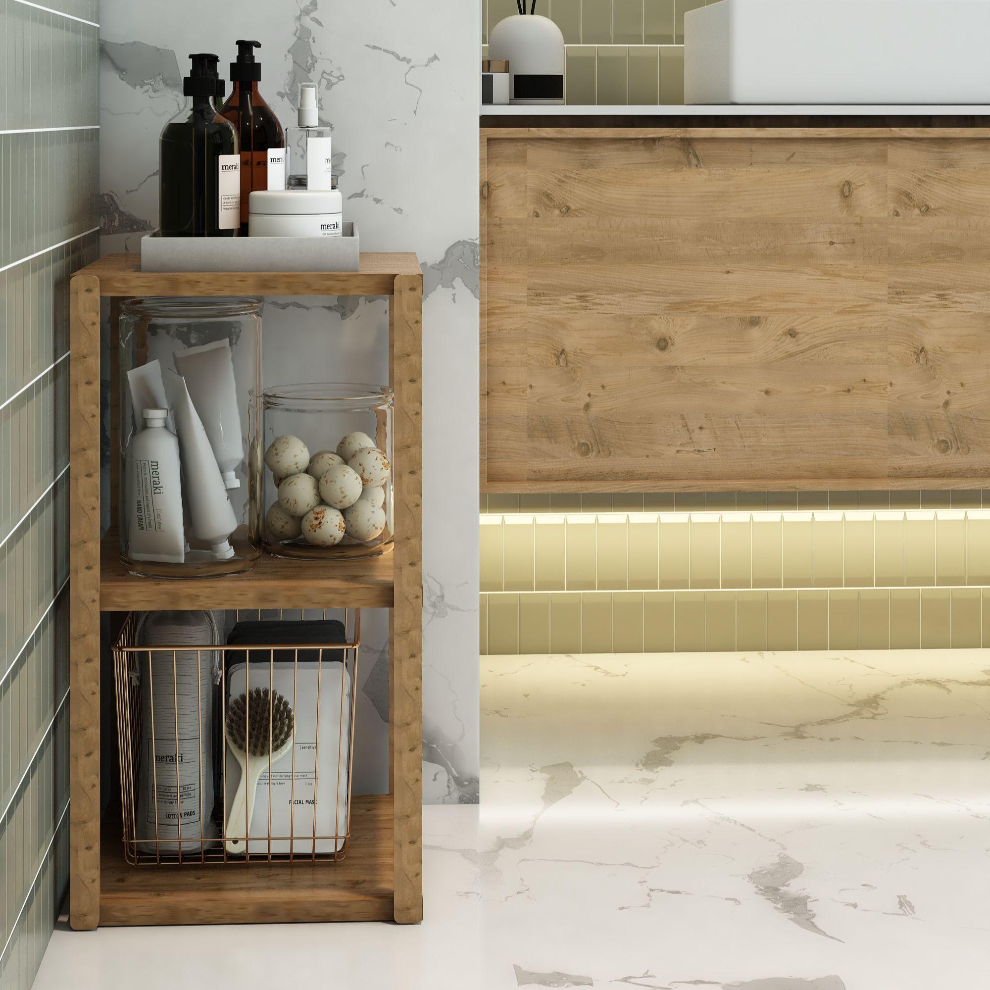 Modern iç mekân dekorasyonuna uyum sağlayan ahşap görünümlü ayaklar ve Atlantik Çam raf yüzeyleri, hem doğal hem de çağdaş bir atmosfer yaratır.