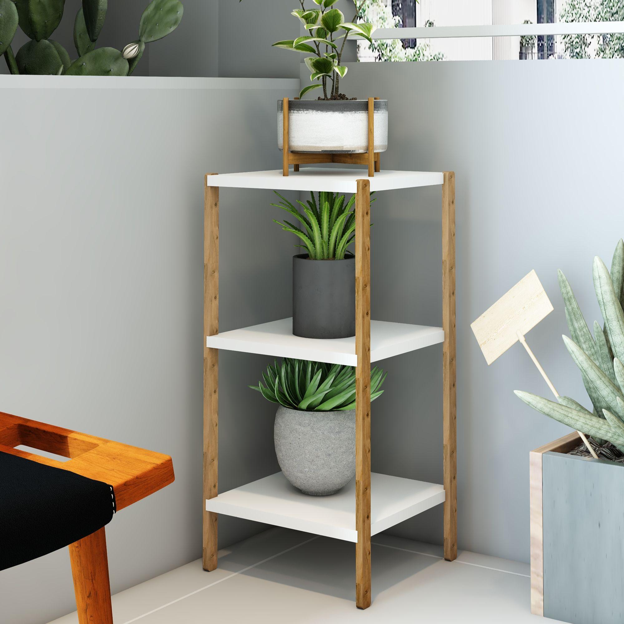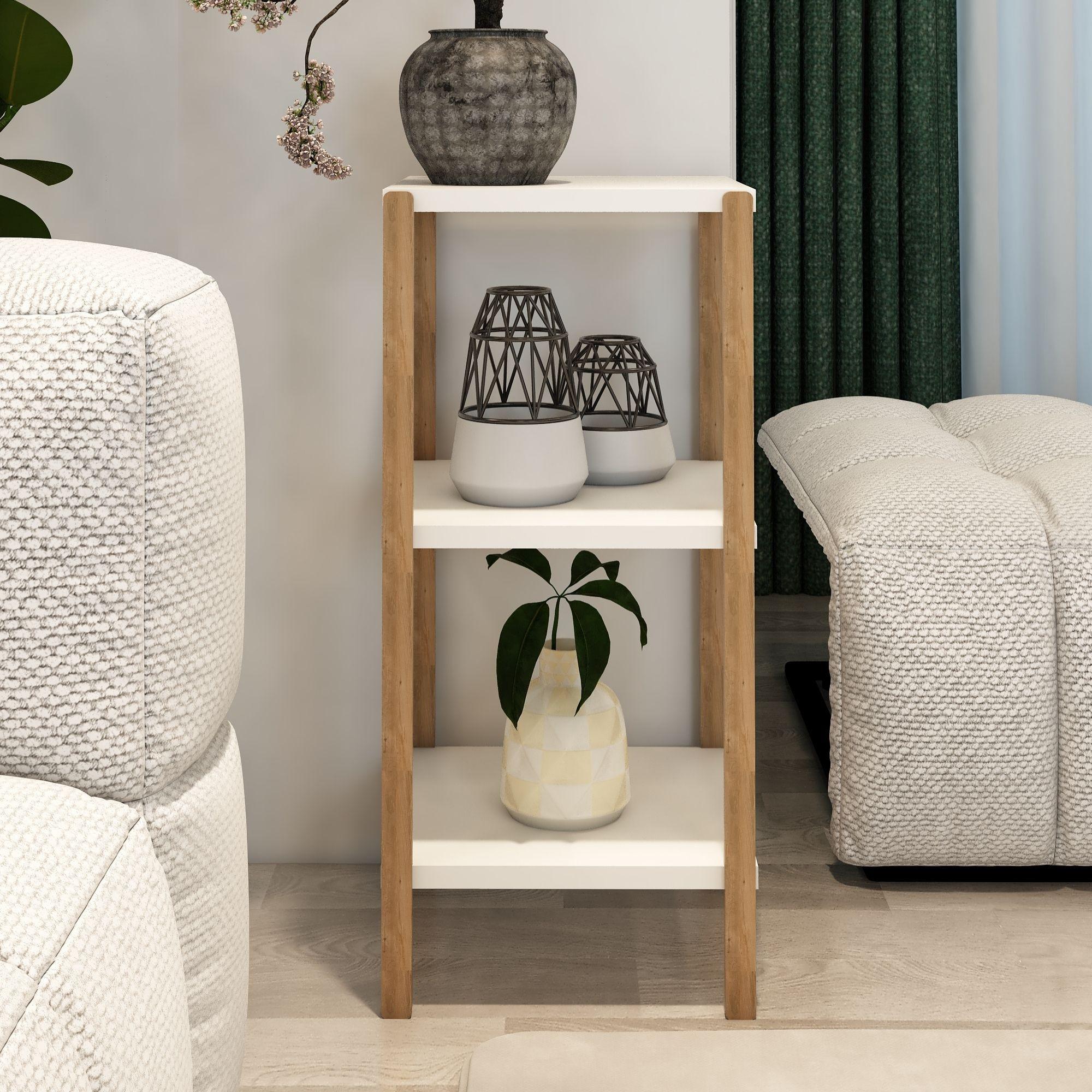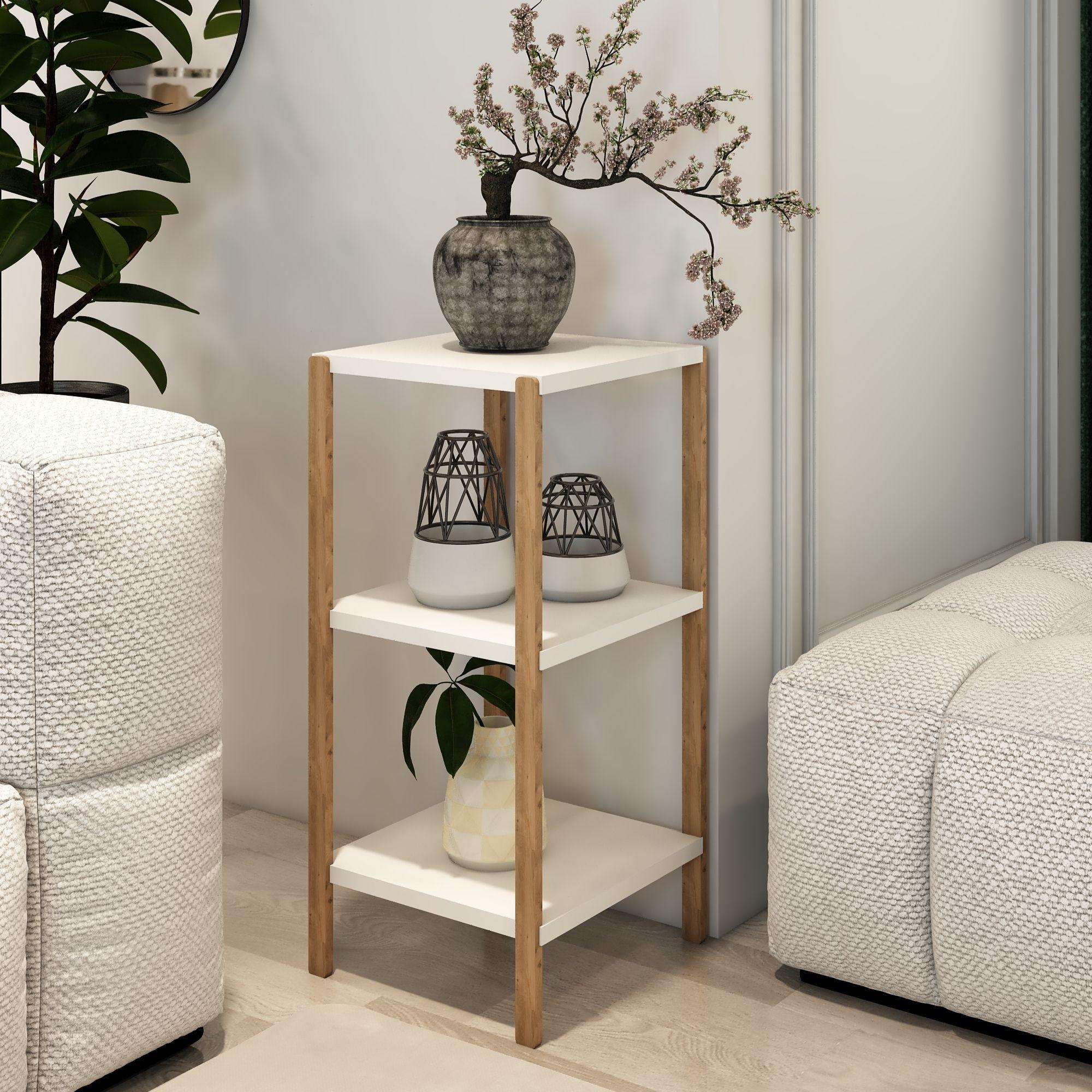Aden 3 Katlı Beyaz Ahşap Köşe Sehpası / Çok Amaçlı Dekoratif Raf, Saksı Standı, Çiçeklik / Mutfak Rafı, Baharatlık / Banyo Rafı