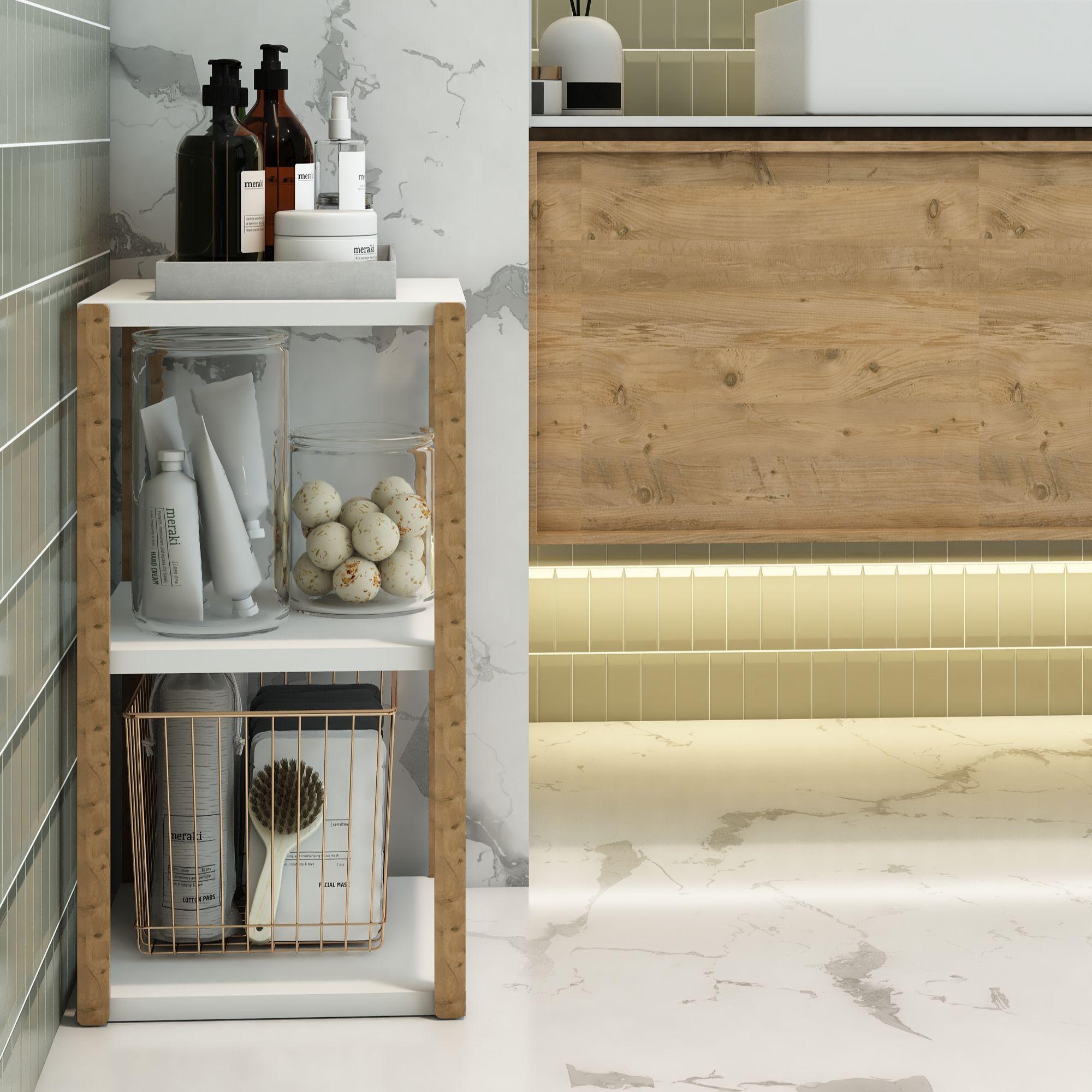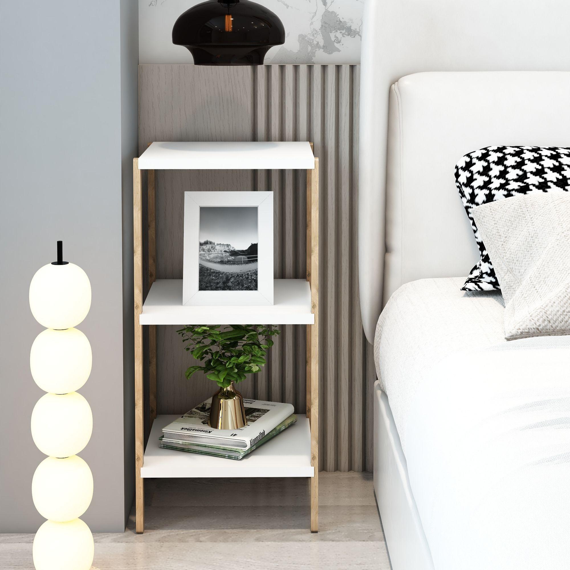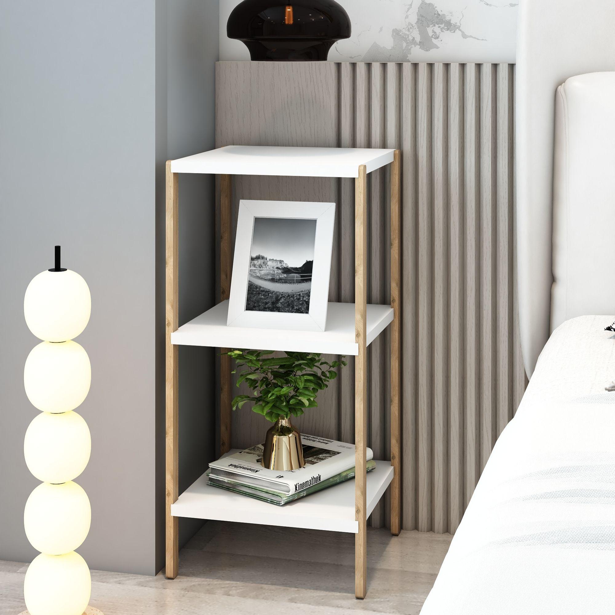 Modern iç mekân dekorasyonuna uyum sağlayan ahşap görünümlü ayaklar ve Beyaz raf yüzeyleri, hem doğal hem de çağdaş bir atmosfer yaratır.