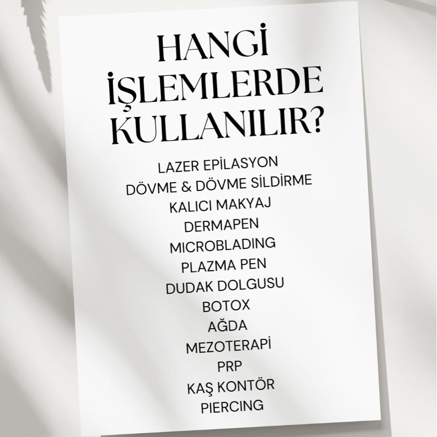 Anestezi Acı Azaltıcı Topikal Krem, lazer epilasyon, kalıcı makyaj, botoks, dolgu, dövme, dövme sildirme, plazma pen, mezoterapi, PRP, dudak dolgusu, dermapen, ağda, kaş kontör, microblading, kulak delme, pirsing gibi acılı işlemlerde kullanılabilen etkili bir üründür. Yüksek etken madde oranı sayesinde uygulama sırasında yaşanan ağrı, rahatsızlık ve acıyı büyük ölçüde azaltır, kullanıcılara rahat bir deneyim sunar.