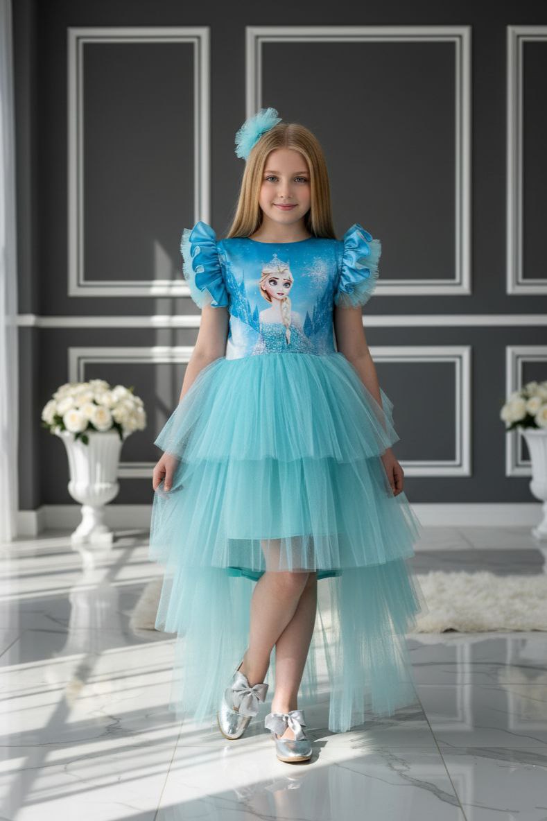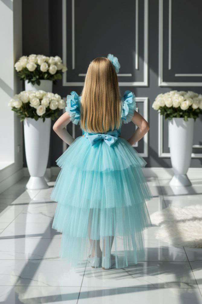 Elsa Turkuaz Katkat Kuyruklu Tarz Çocuk Abiye, şıklığı ve zarafeti bir arada sunan tasarımıyla dikkat çeker.