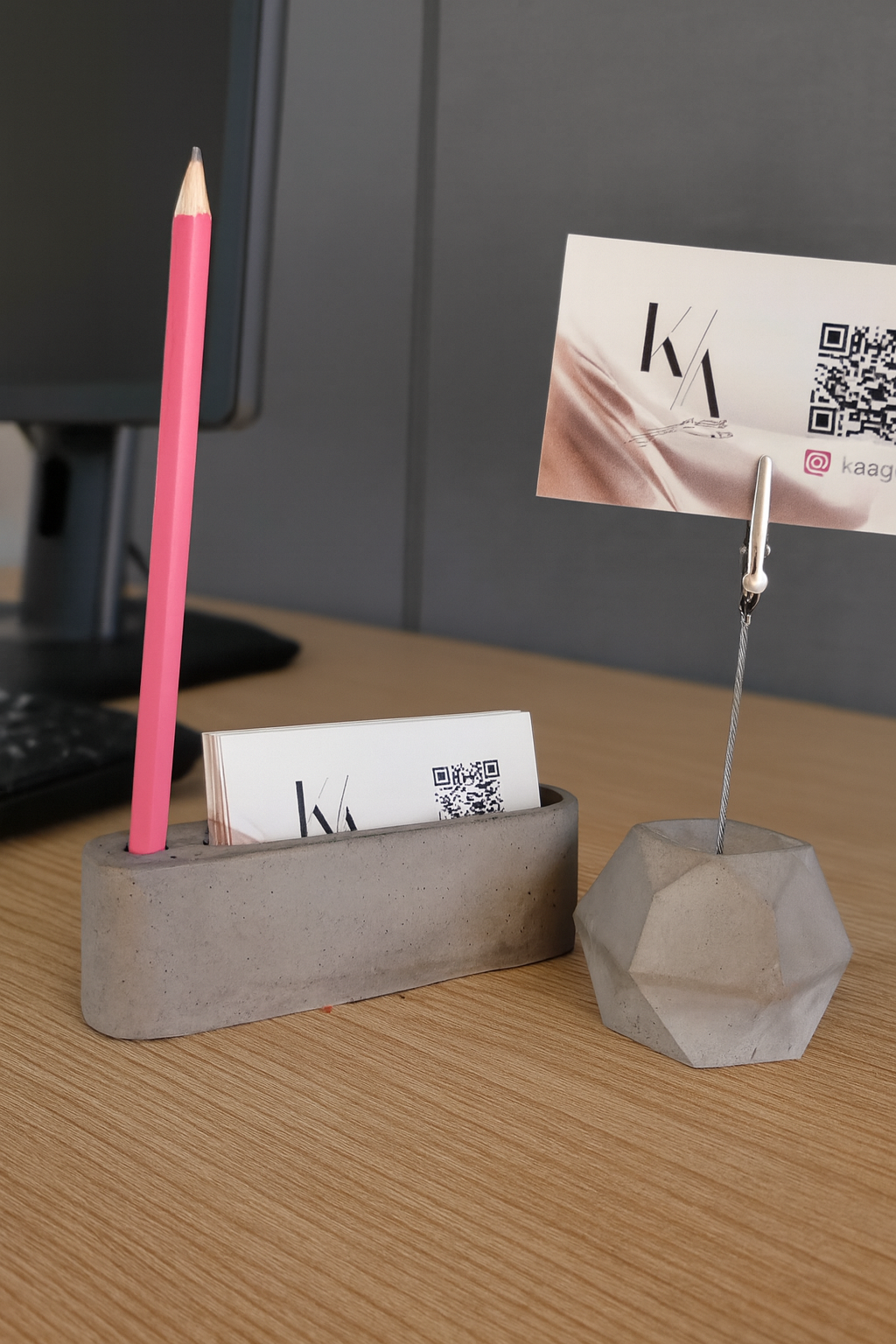 El yapımı minimalist beton ofis seti; kalemlik ve kartvizitlik bölümleriyle masanızı şık ve düzenli tutar. Dayanıklı yapısı, modern tasarımıyla ofisinizin dekoruna estetik bir dokunuş katar.