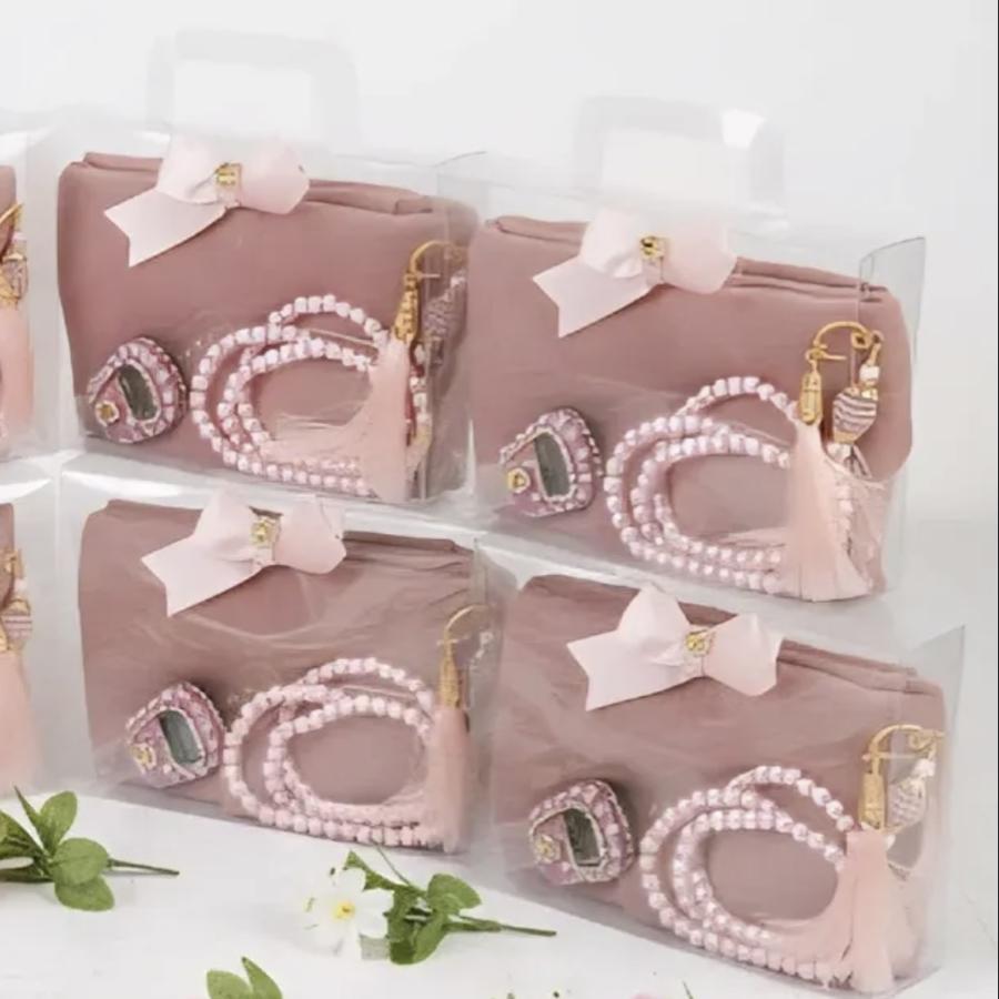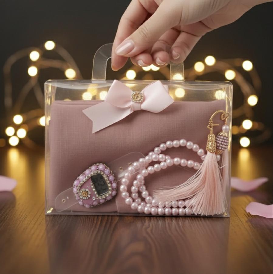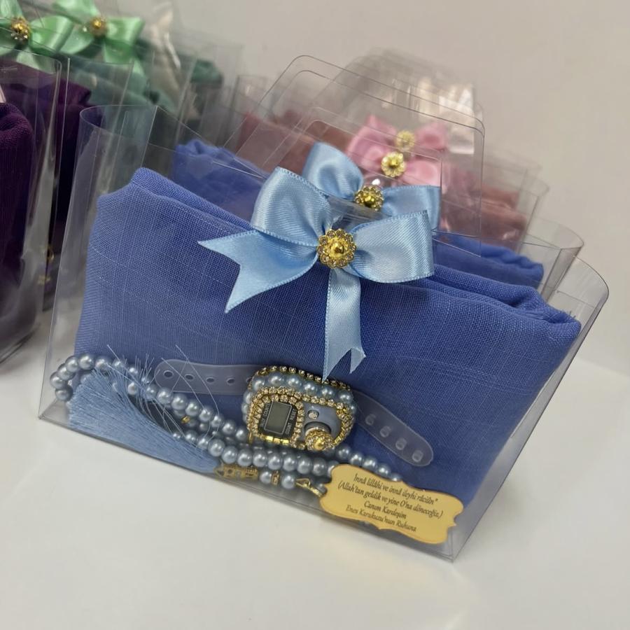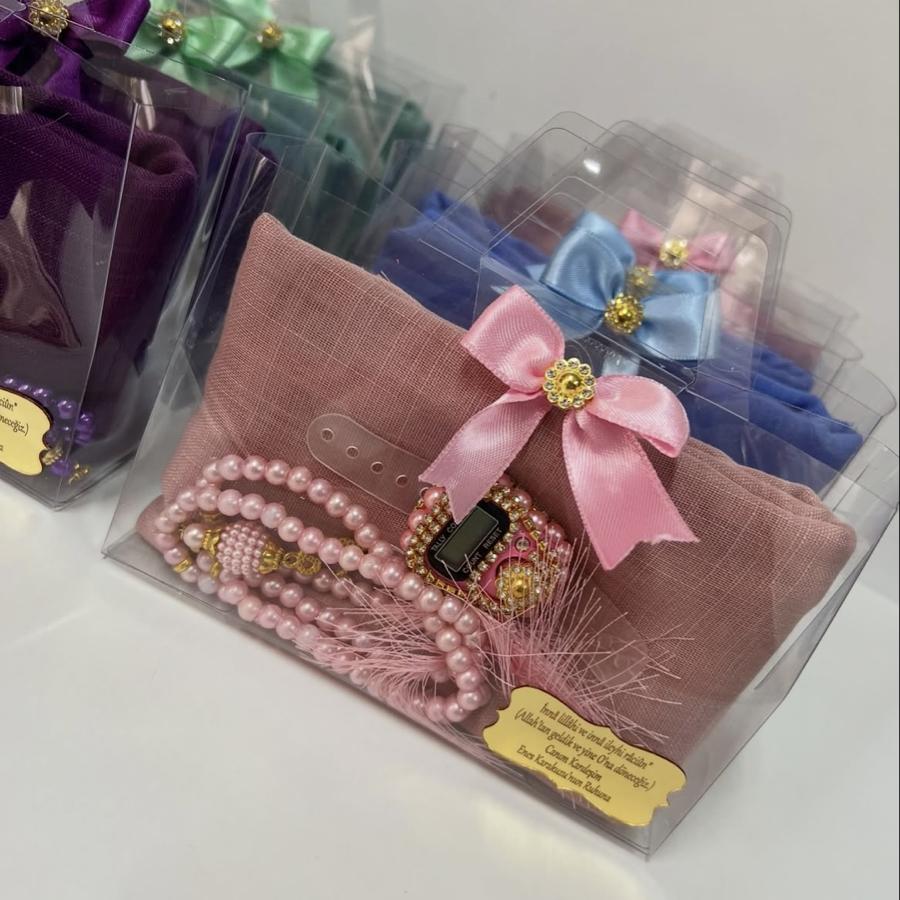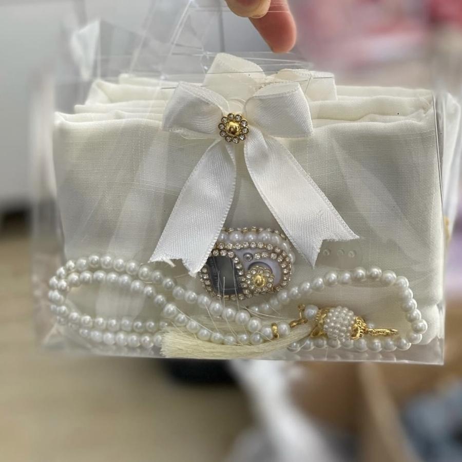 Hediye kutusunda başörtü yazma taşlı zikir ve inci Tesbih hediyelik ürün görselde görüldüğü gibi gelir