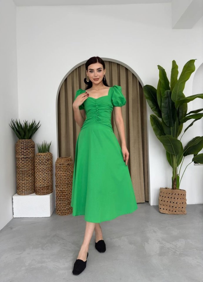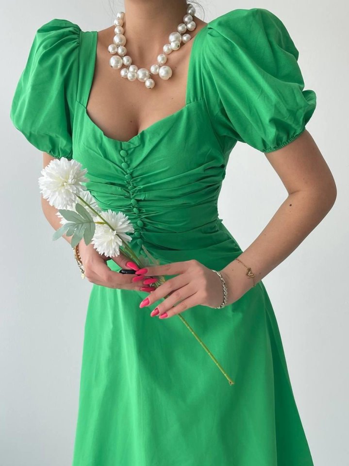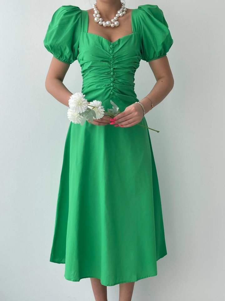 Kare Yaka Düğmeli Elbise