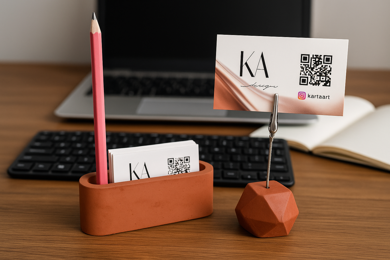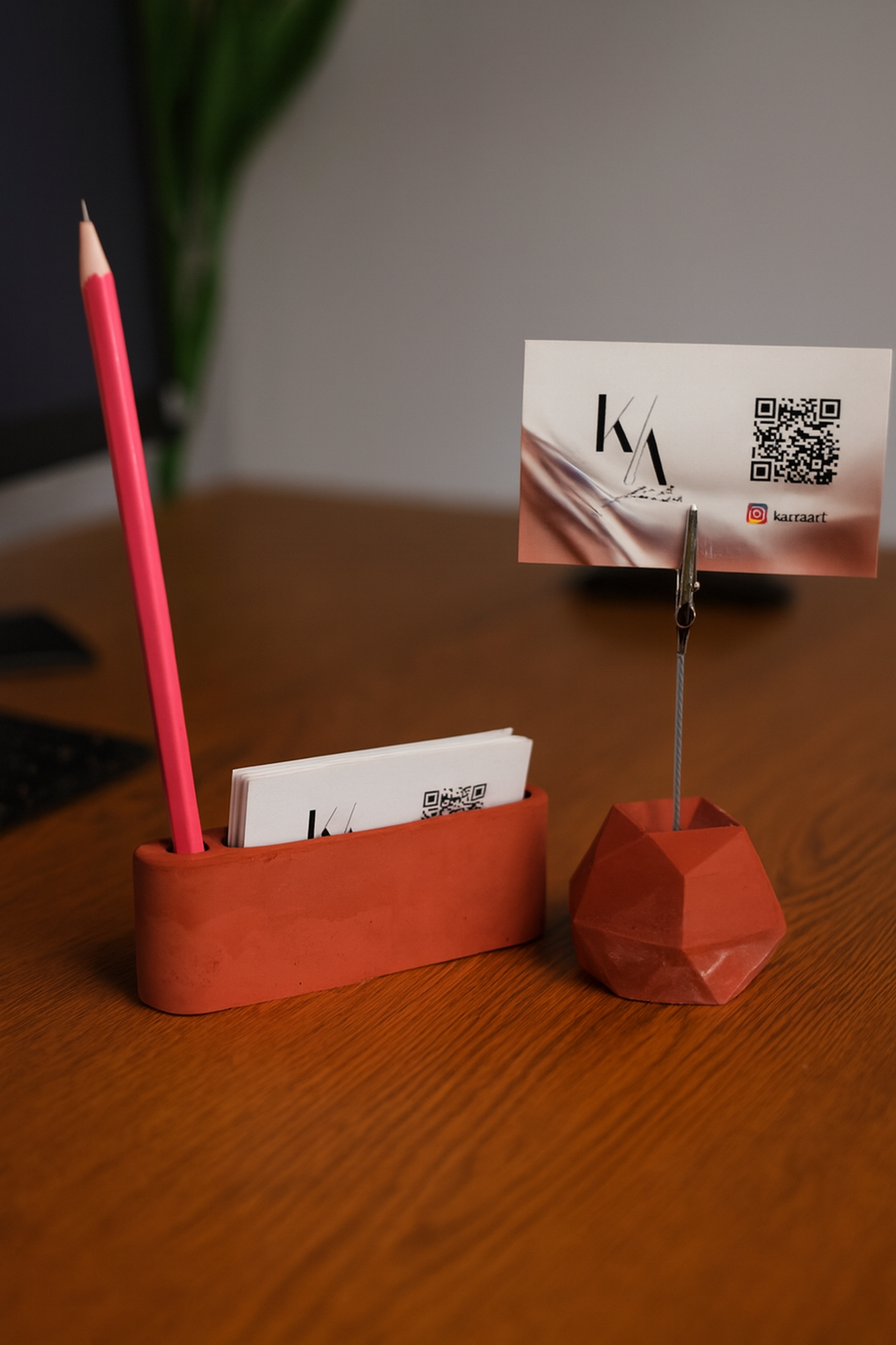 El yapımı minimalist beton ofis seti; kalemlik ve kartvizitlik bölümleriyle masanızı şık ve düzenli tutar. Dayanıklı yapısı, modern tasarımıyla ofisinizin dekoruna estetik bir dokunuş katar.
