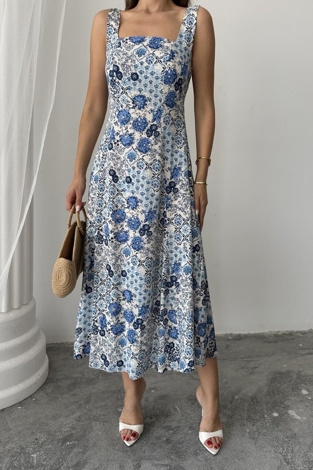 Mavi Çiçekli Viskon Elbise