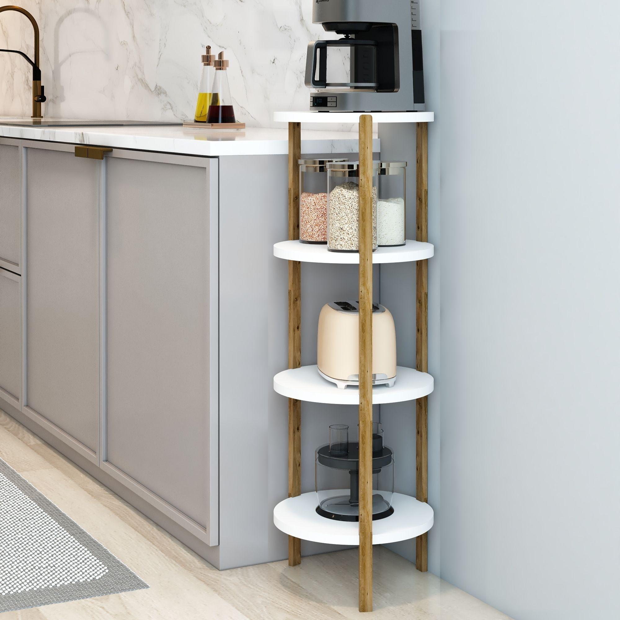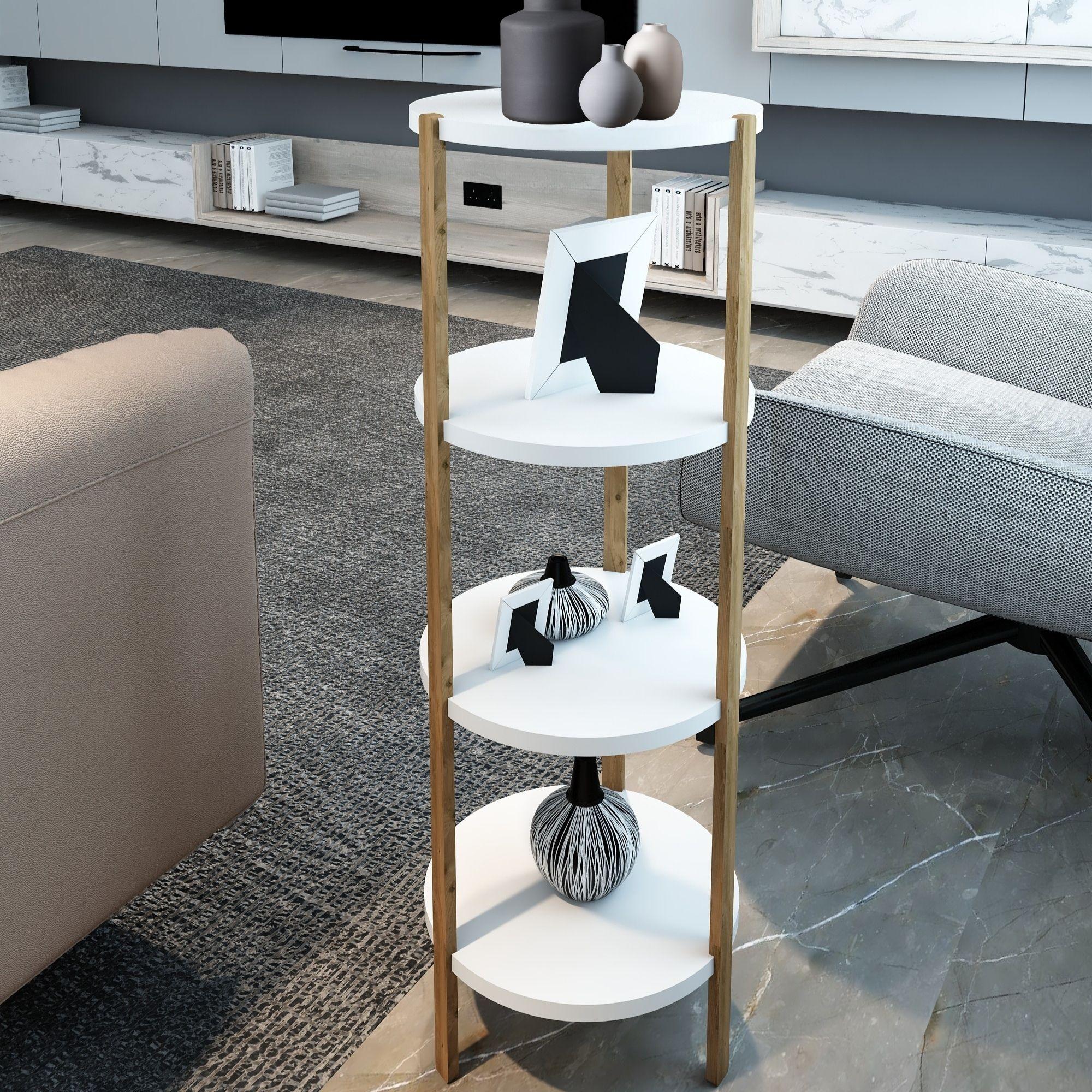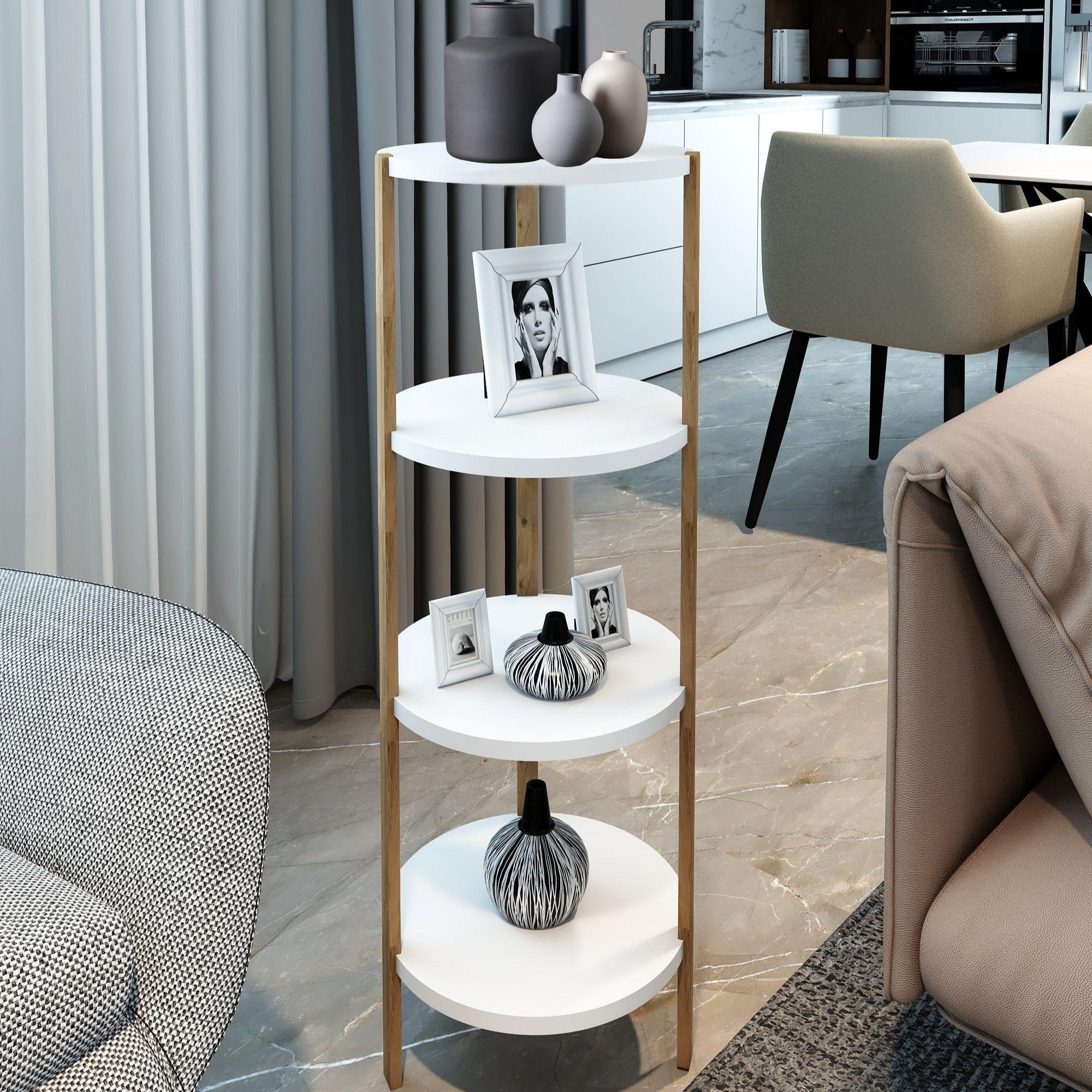 Jest Dekor Konsept Miray 4 Raflı Yuvarlak Çok Amaçlı Ahşap Sehpa, hem fonksiyonel hem de estetik tasarımıyla evin her köşesinde kullanabileceğiniz çok yönlü bir üründür. Yüksekliği 91 cm, genişliği 32,5 cm olan bu sehpa, zarif yuvarlak rafları ve 25 cm aralıkları sayesinde çeşitli dekoratif eşyaları sergilemek için veya işlevsel kullanım seçenekleri sunuyor.
