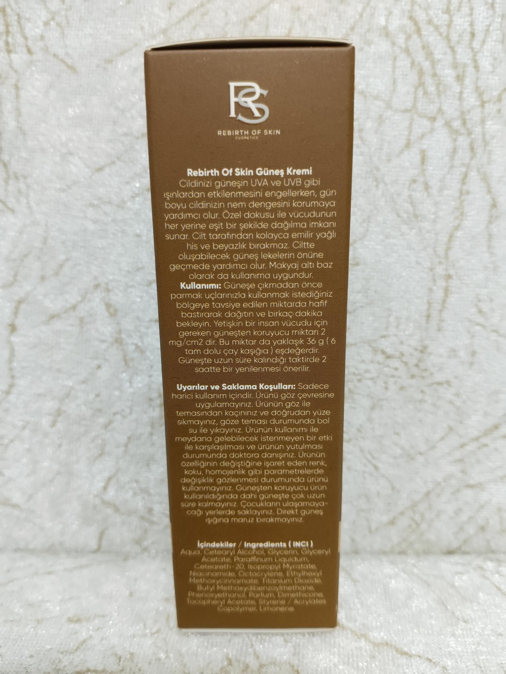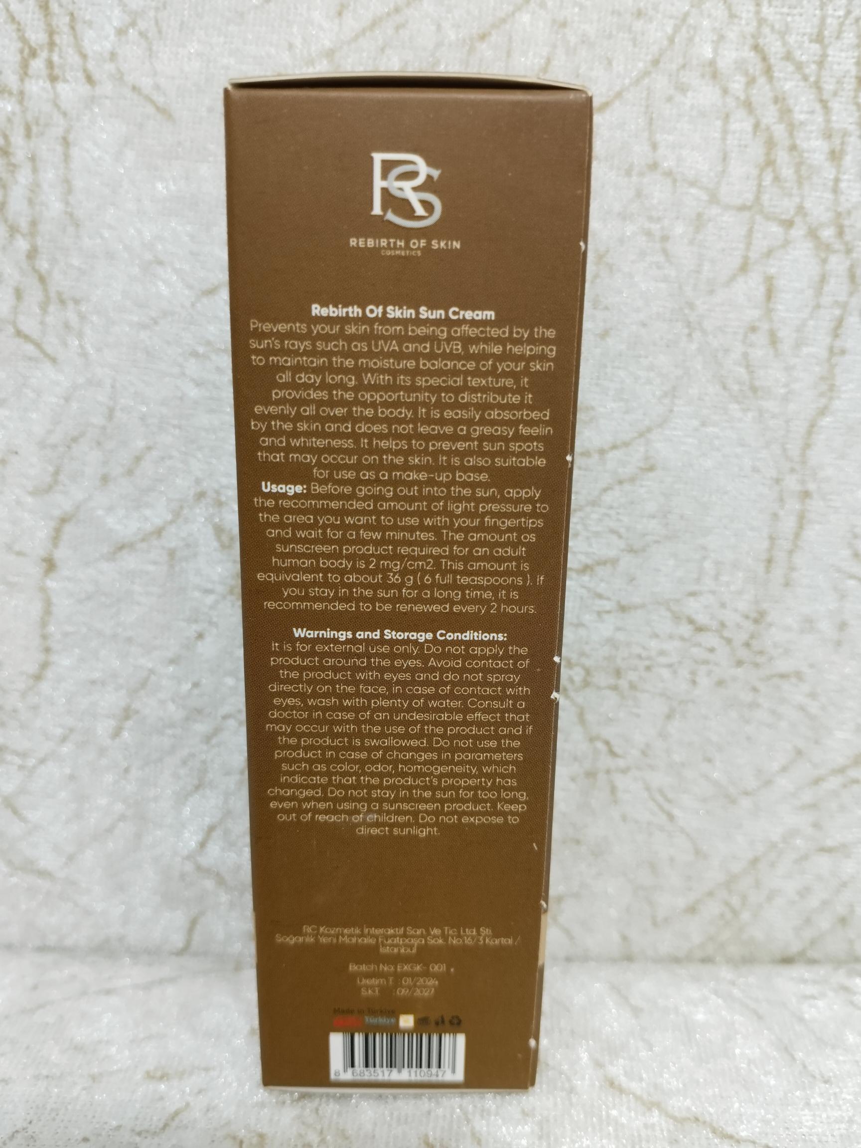 Rebirth Of Skin SPF 50+ Güneş Kremi, cildinizi güneşin zararlı etkilerinden korumak için özel olarak formüle edilmiş yüksek koruma sunan bir üründür. Güneşin UV ışınları, ciltte erken yaşlanma, lekelenme ve cilt kanseri riskini artırabilir. Bu nedenle, cilt bakım rutininizin vazgeçilmez bir parçası olarak Rebirth Of Skin Güneş Kremi'ni tercih edebilirsiniz.