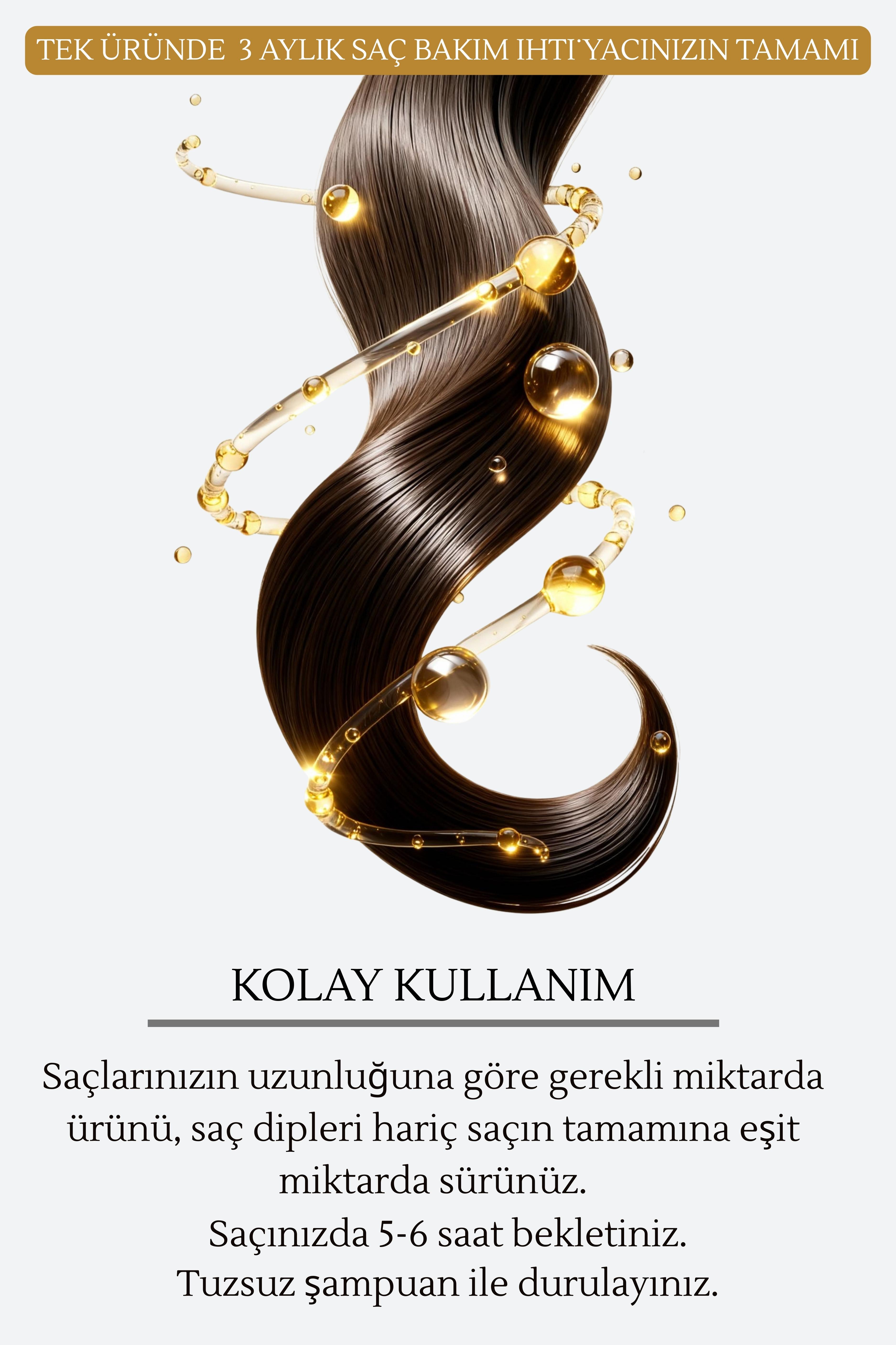 Kullanım: Saçınızı tuzsuz şampuan ile yıkadıktan sonra, ürünün küçük bir miktarını saça uygulayın ve yedirin. Saç diplerine sürmekten kaçının. Ürünü 6 saat boyunca saçınızda bekletin. Bekleme süresi bittikten sonra, saçı tekrar tuzsuz şampuanla yıkayın.