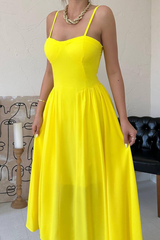 Sarı Göğüs Kuplu Uzun Büzgülü Elbise