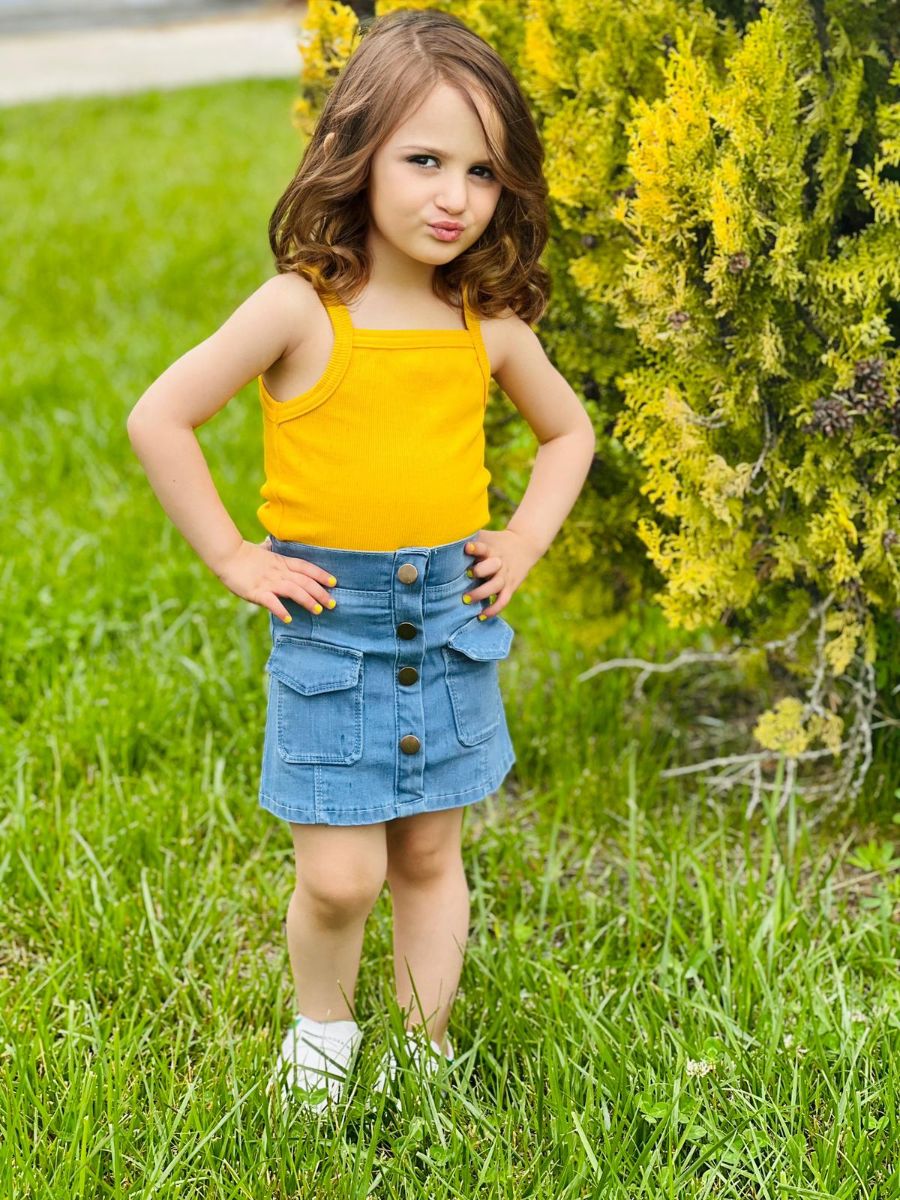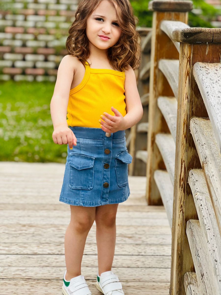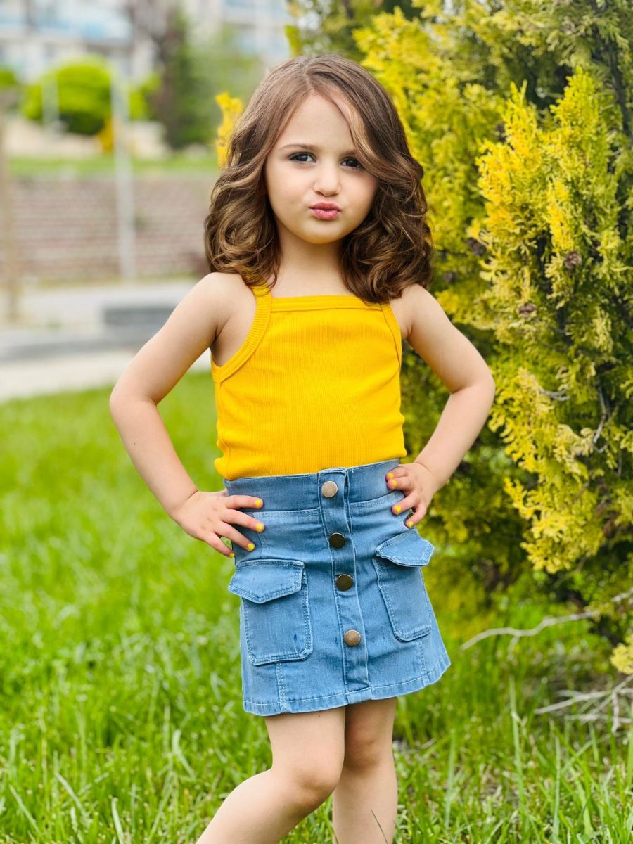 Fırsatlarla dolu yaz günleri için mükemmel bir seçim! Sarı Renk Kız Çocuk Askı Badili Kot Etek Takımı, minik kızların gardırobuna neşe katacak ve hem şık hem de rahat bir görünüm sunacak. Bu özel tasarım, hareket özgürlüğü sağlayarak çocukların eğlenceli anlarını destekler.