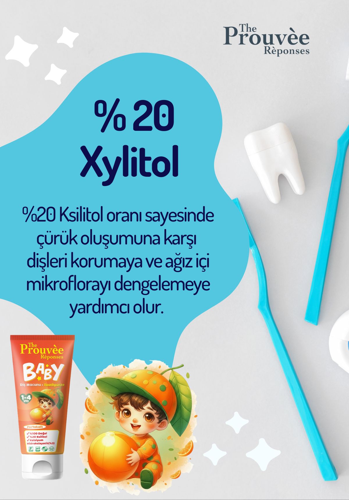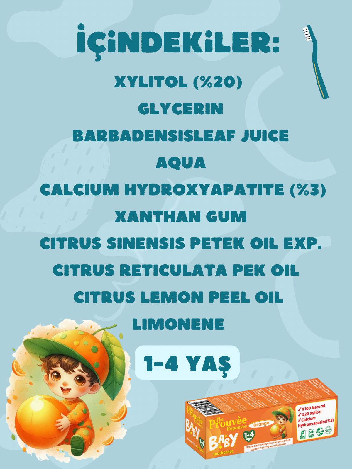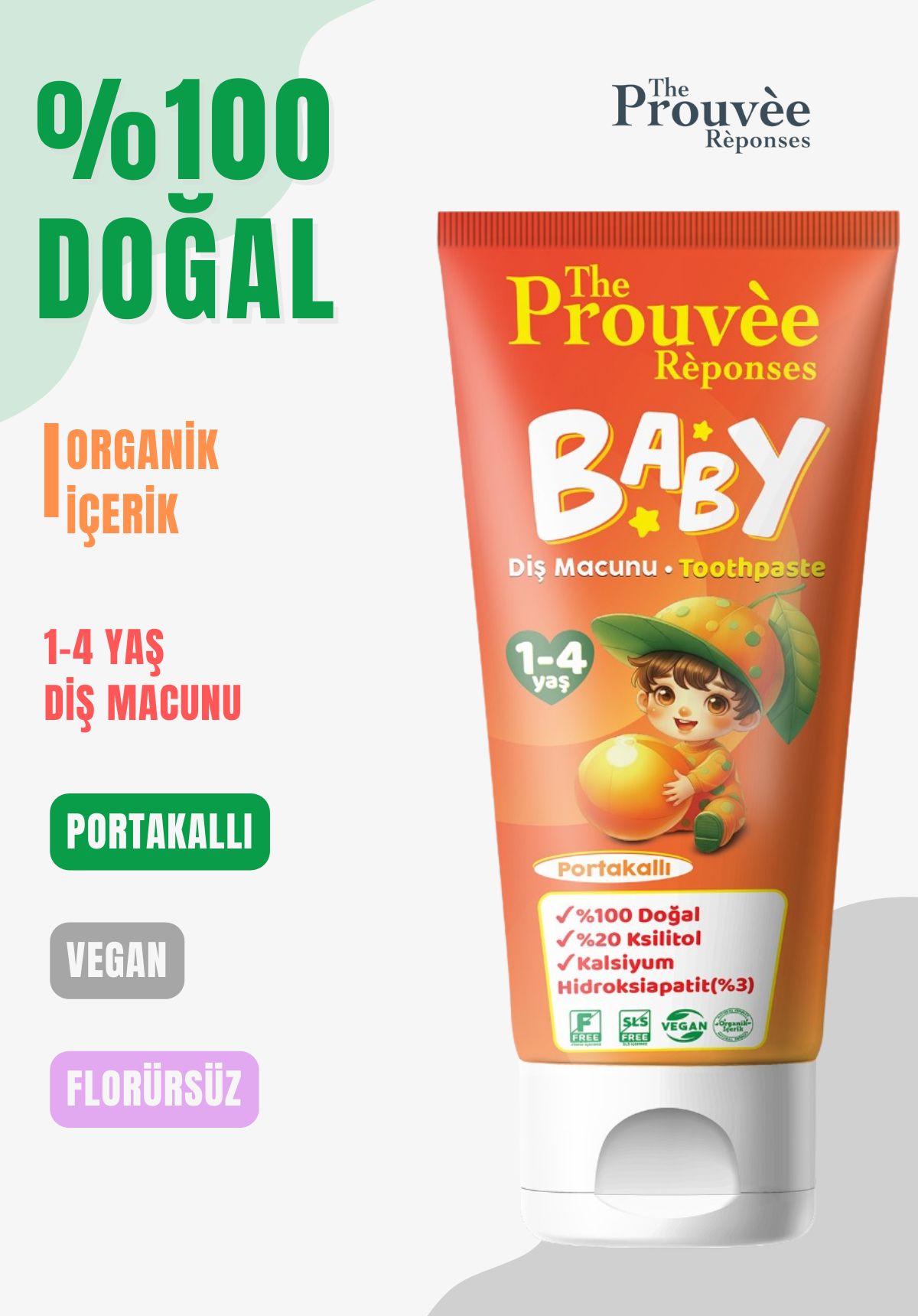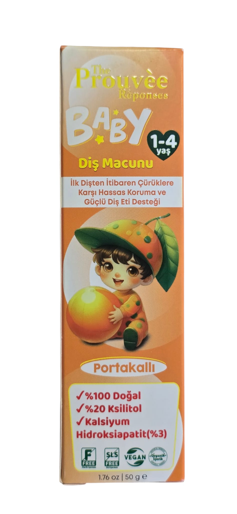 Yeni 50ml ambalajında, Yeni Nesil, Yeni Tat Portakallı Bebek ve Çocuk Diş Macunu %20 Xylitol + %3 Hydroxapalite